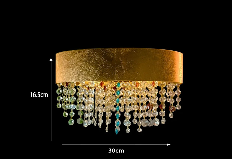 The Aurulent Deliquescence Wall Éclat presents a mesmerizing spectacle of effulgent pendeloques suspended from a lustrous, auriferous plane. Faceted crystals of hyaline, citrine, and cerulean hues descend in a gradated catenation, exhibiting a scintillating refraction of ambient luminescence. This opulent sconce bestows upon its environs an aura of palatial resplendence and captivating iridescence.
