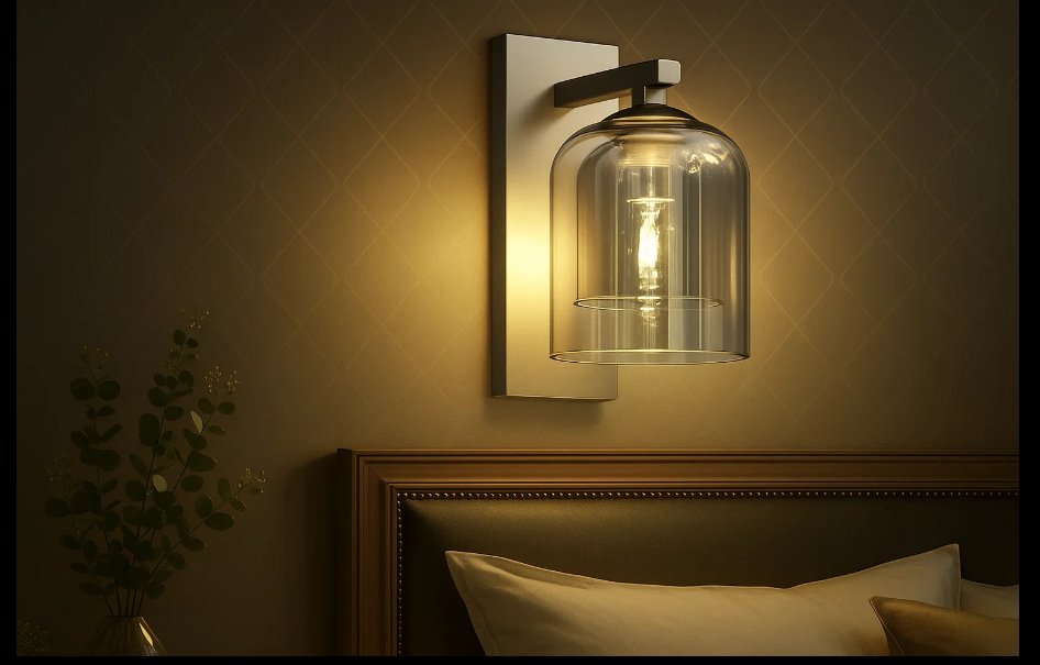 This modern wall sconce features a clear, glass bell-shaped shade paired with elegant metal accents, creating a soft, diffused light and timeless design.