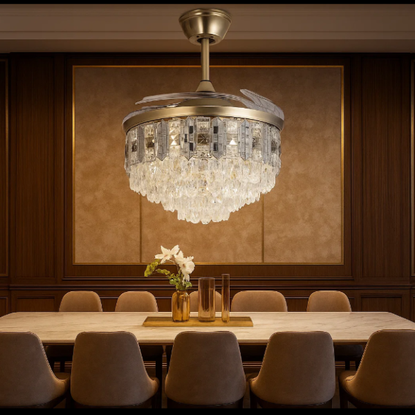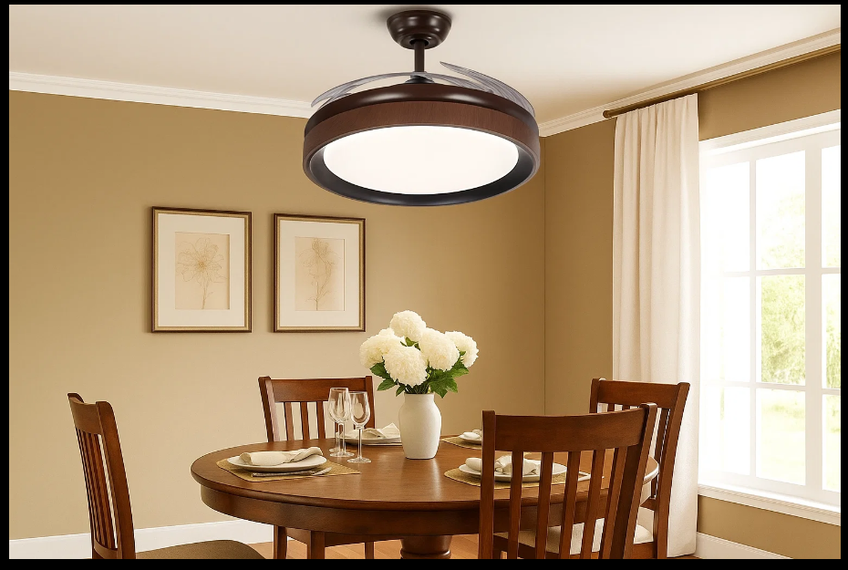 Concealed blades, finished in a rich, dark tone, generate a gentle and unobtrusive airflow, maintaining comfort without drawing visual attention.