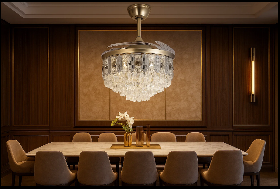 The Crystalline Descent Ceiling Fan presents a harmonious fusion of opulent illumination and refreshing air circulation.