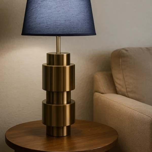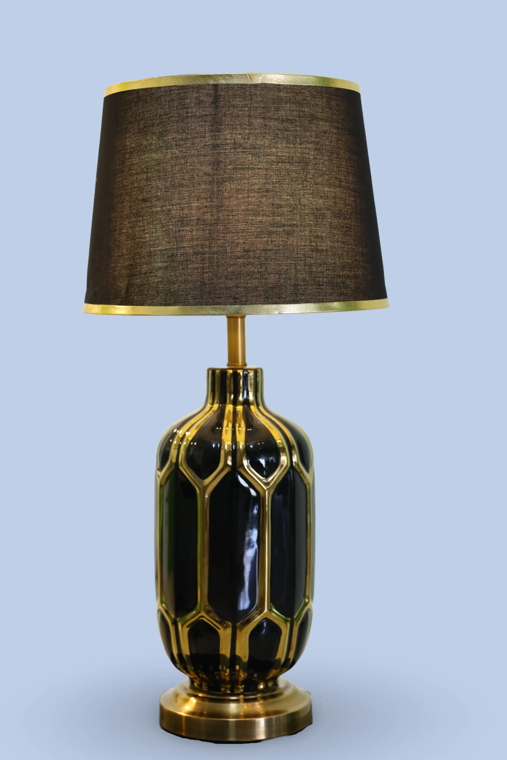 Vetro HexaThis stylish table lamp features a glossy black ceramic base with an elegant gold geometric overlay design. It’s paired with a dark lampshade accented with gold trim, offering a blend of modern and sophisticated lighting.
