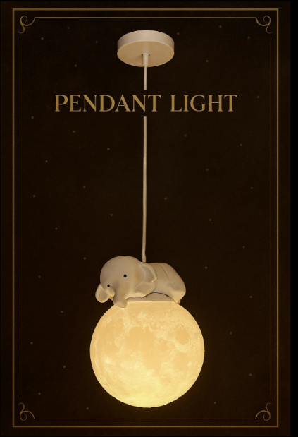 The Dreamy Moon Buddy Pendant features a glowing, spherical shade resembling a gentle moon, with a cute animal figure resting on top. The internal source projects a soft, comforting emission, perfect for a child’s bedroom in Hyderabad. Suspended by a simple cord, this pendant offers a touch of whimsy and a comforting glow for bedtime in the City of Pearls.
