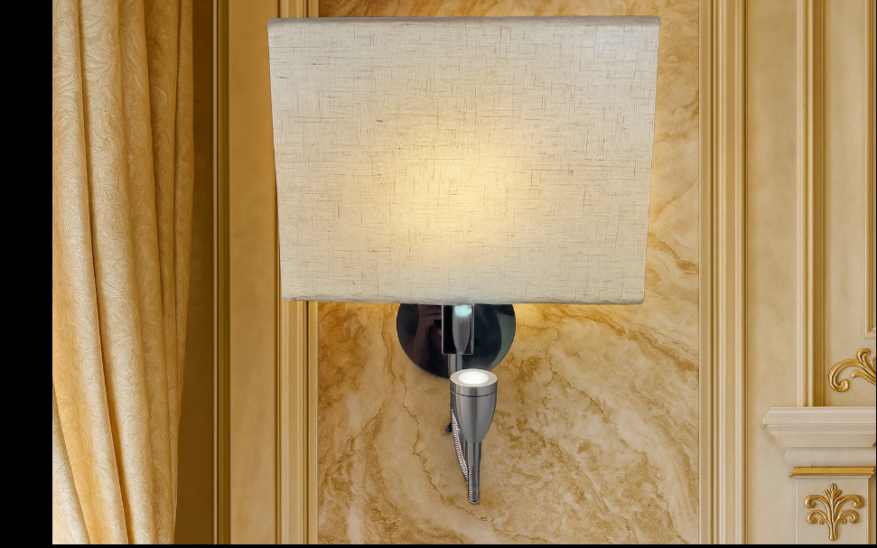 The Dual Beam Wall Lamp features a rectangular fabric shade with a warm, inviting glow and an adjustable LED reading light for focused illumination.