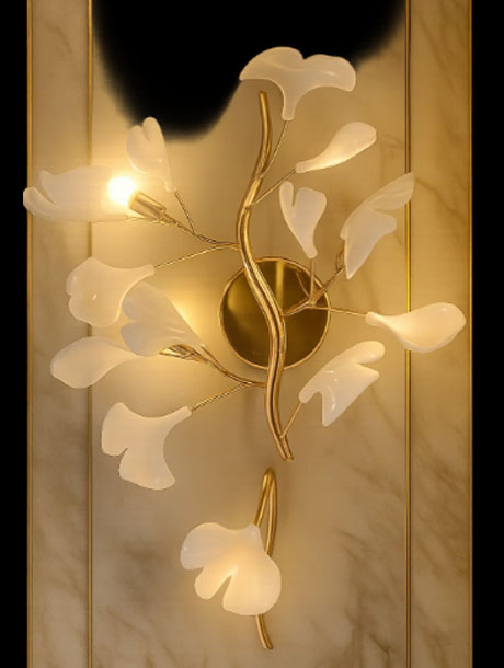 The primary subject is a decorative wall-mounted light fixture designed to resemble a flowering branch. Ginkgo-like Leaves/Petals: The individual light diffusers are shaped like stylized leaves or petals, strongly resembling Ginkgo Biloba leaves, made of a translucent, milky-white material (likely frosted glass or acrylic). Gold Branches/Stems: The structure holding these “leaves” is crafted from a gold-toned metal, forming elegant, curving branches or stems that emanate from a central circular base. Warm Illumination: The light emitted from some of the leaves is a warm, soft glow, indicating integrated LED or small bulbs within or behind the leaf elements. Elegant Background: The sconce is mounted on a light-colored, possibly marble or alabaster-textured wall panel, framed by vertical gold or brass strips, enhancing its luxurious appearance. Artistic & Decorative: The overall design is highly artistic and serves as both a light source and a significant decorative element, suggesting a high-end interior.