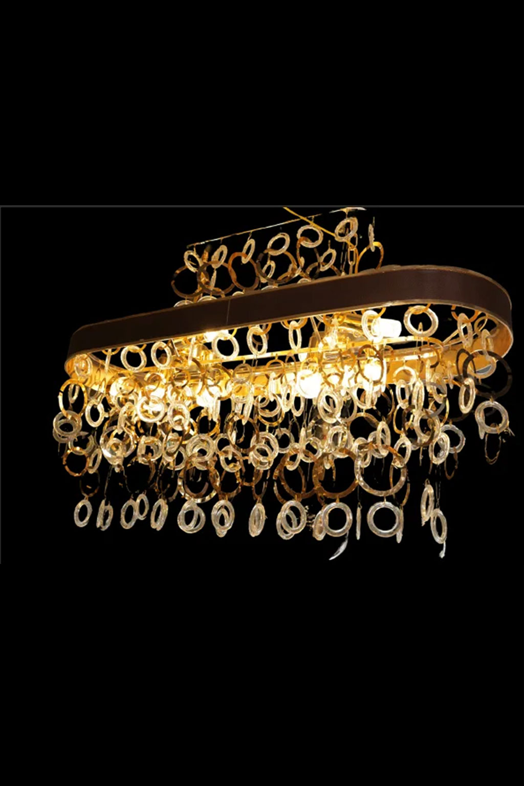 Oval crystal chain chandelier with metallic frame and hanging crystal links. The linear design and sparkling crystals create a modern and luxurious interplay of light.