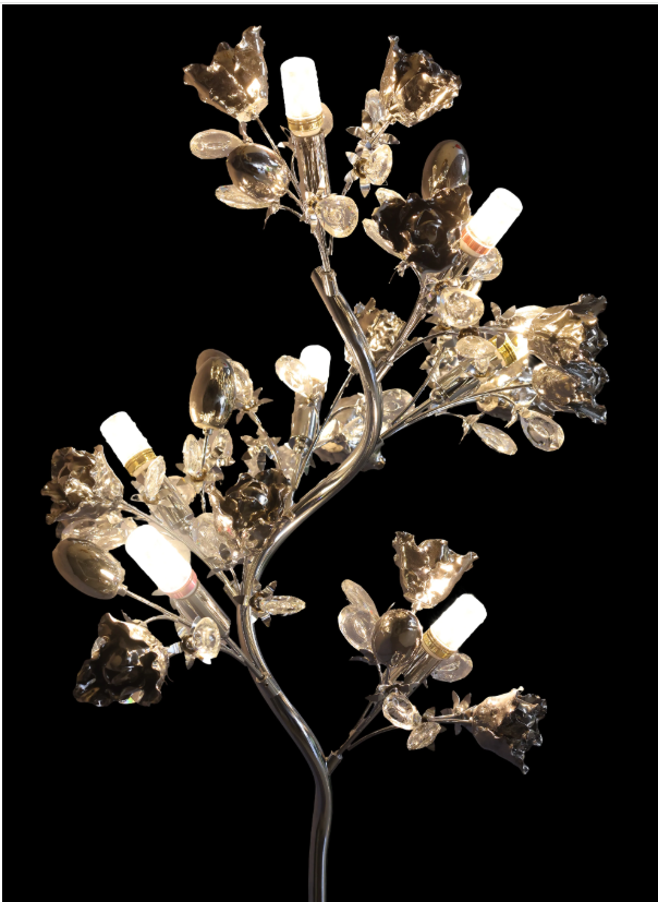 This elegant floor lamp is a sculptural artwork of crystal or glass flora illuminated by integrated lights. Its branching design and delicate blossoms create a warm ambiance and mesmerizing light play. A sophisticated centerpiece, it blends natural inspiration with refined craftsmanship, adding ethereal beauty to any space.