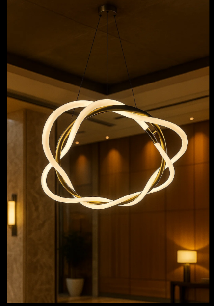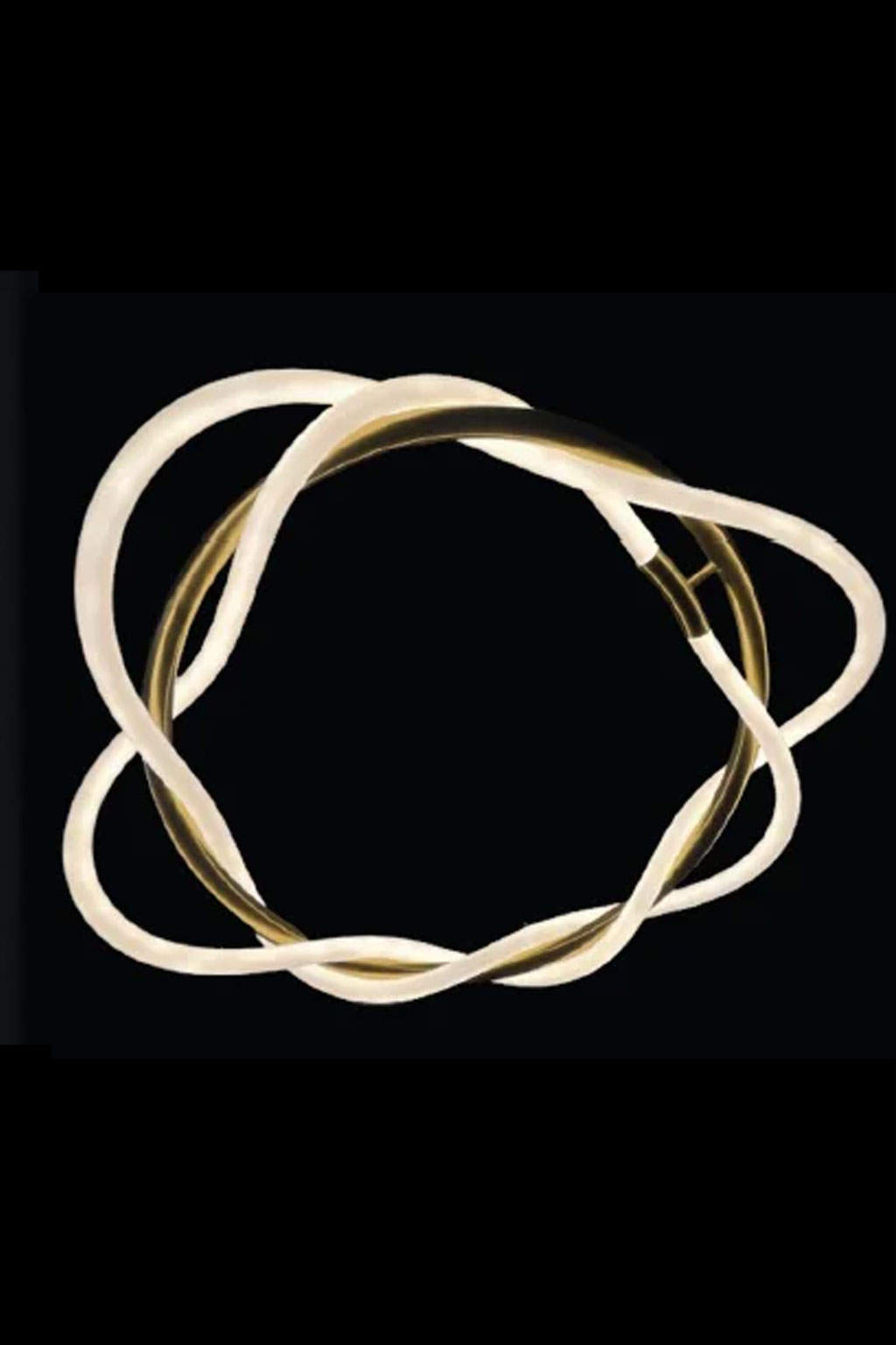 The Moebius Interwind Strand Luminaire features a captivating, circular arrangement of three interconnected, elongated forms, crafted from a warm-toned metal. The internal mechanisms cast a gentle and inviting illumination from within the translucent, textured components of each loop, creating a sense of continuous flow and modern artistry. This chandelier introduces a unique and elegant touch to any space.