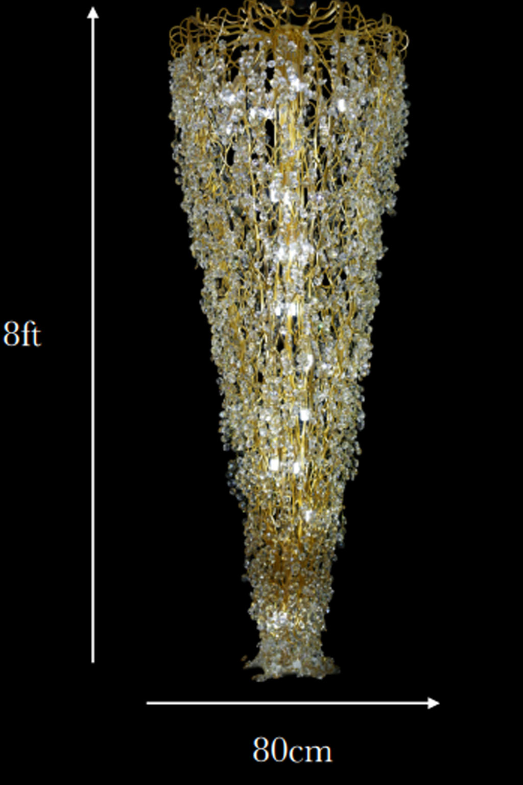 This stunning chandelier captivates with its lavish arrangement of crystal elements that reflect a warm, golden light. The numerous, delicate crystals are arranged in a cascading form, creating a sparkling and luxurious ambiance. The complex structure and the meticulous arrangement of flawlessly cut crystals suggest an exquisite design, reflecting exceptional attention to detail and superior material selection. This chandelier is ideal for adding an opulent and glamorous touch to a room. The precision and artistry evident in the crystal work and the elaborate design indicate a piece of significant value.
