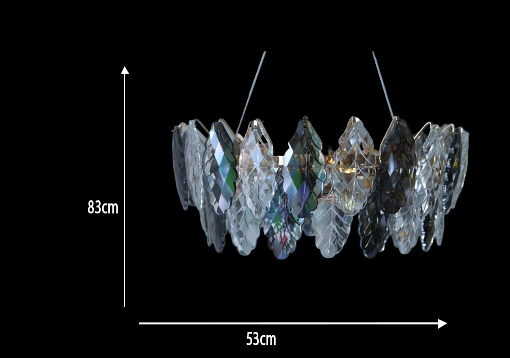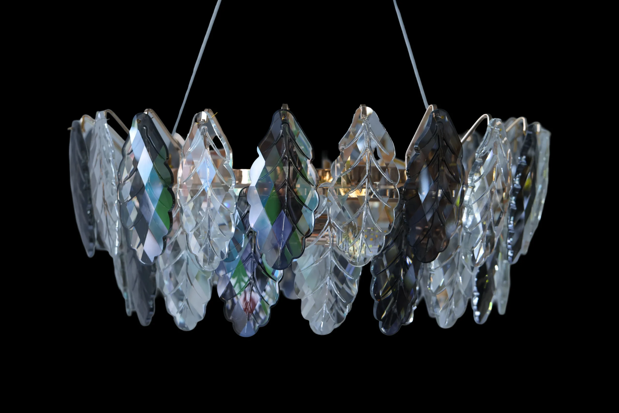 The Circular crystal leaf chandelier with organic, leaf-like crystal elements. The natural design and sparkling crystals create an elegant and atmospheric interplay of light. This circular crystal leaf chandelier features organic, leaf-like crystal elements arranged in a circular pattern. The sparkling crystals and natural form lend a grand yet organic ambiance to any room. The translucent crystals and circular structure create an elegant and atmospheric interplay of light. This fixture is ideal for living and dining areas seeking a statement and luxurious lighting piece