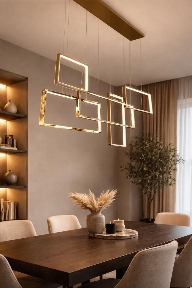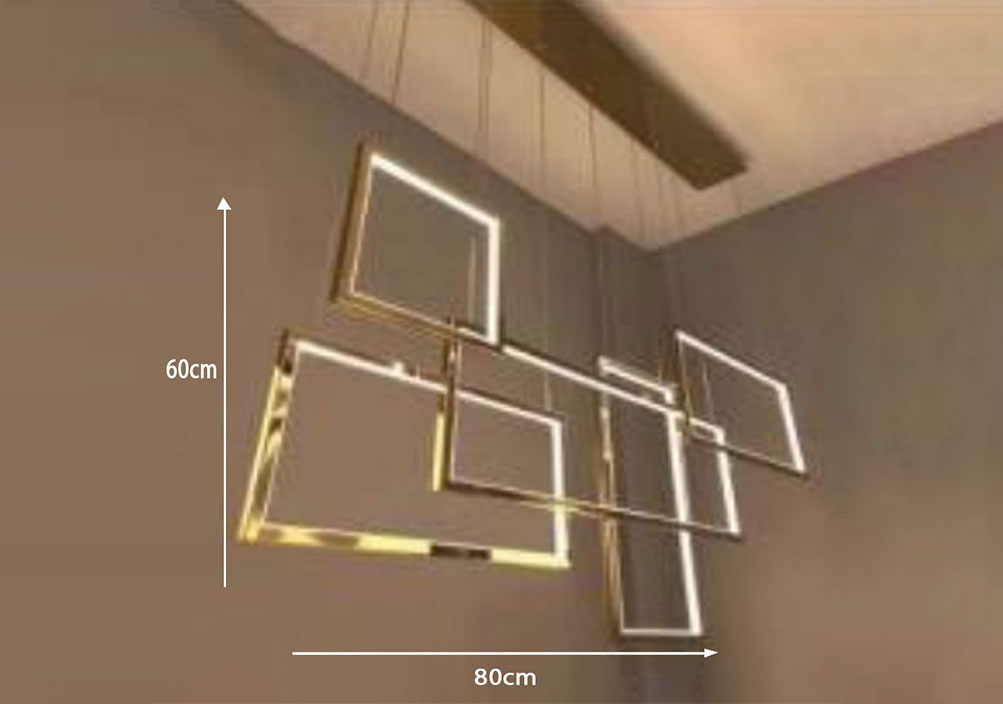 Modern Gold Chandelier with geometric frames and LED lighting. The nested, square frames create a dynamic interplay of light and add contemporary elegance to rooms.