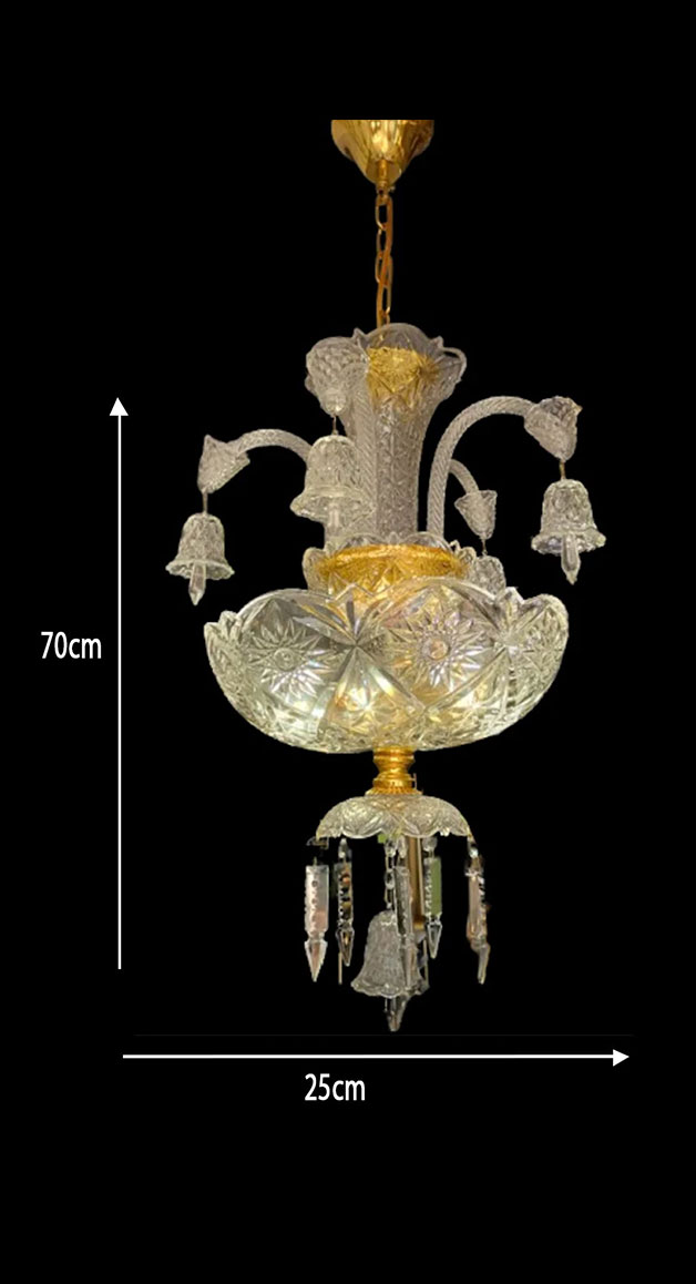 A majestic chandelier featuring cut glass elements and golden accents, radiating brilliance and grandeur in any elegant setting.