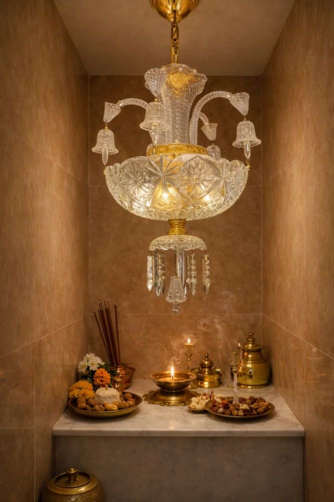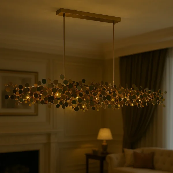 Delicate pendants and sculpted glass forms add layers of visual complexity, enhancing the chandelier’s luxurious presence.