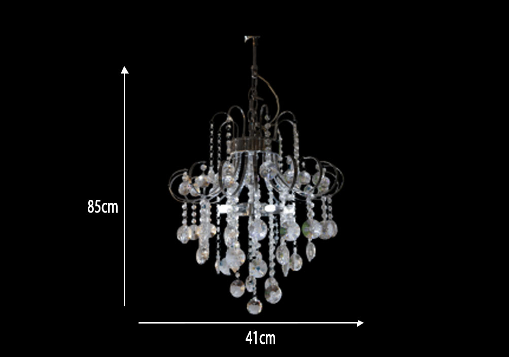 The Rosina 5 Light Pendant features a classic design with curved, polished chrome arms and abundant crystal embellishments. The sparkling crystals reflect light in a multitude of ways, creating an elegant and opulent interplay of light that adds a luxurious touch to any room. This fixture is ideal for living and dining areas seeking a classic yet glamorous ambiance.