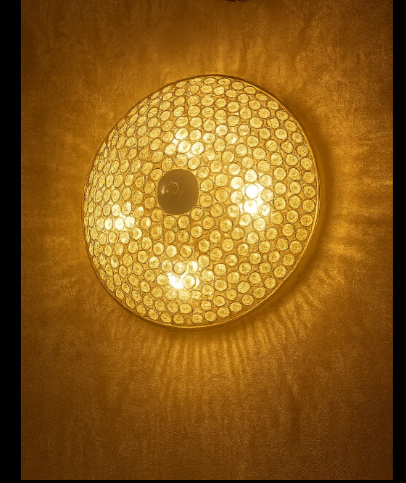 The light emitted is a very warm, golden-yellow hue, casting a soft glow. Light Spill/Shadow Play: The texture of the light creates interesting patterns of light and shadow on the surrounding wall, suggesting a decorative light distribution.