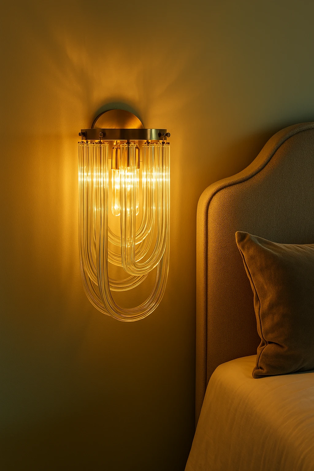 Véloire is a A fluid dance of light and crystal. This sconce captures the essence of flowing elegance, its curved crystal forms cascading like liquid light against a backdrop of warm, golden metal. It’s a touch of refined artistry, transforming your walls into a gallery of subtle brilliance.