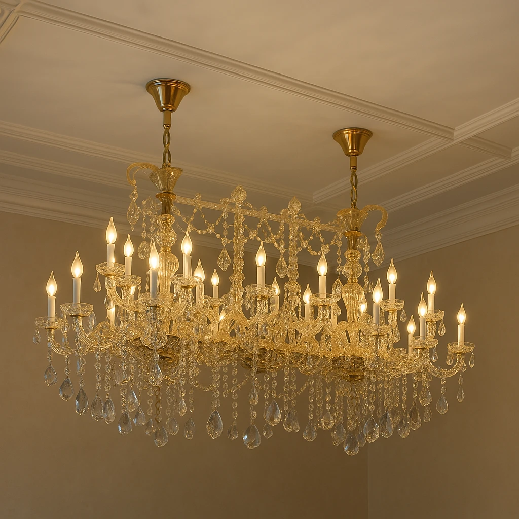 Regalia Grandeur “A constellation descends, a gilded cage overflowing with captured light. This chandelier isn’t mere illumination, it’s a frozen moment of liquid gold, crystallized. Each facet, a tiny mirror to the soul of the room, fractures light into a thousand whispers. It’s a relic of forgotten palaces, a beacon of whispered elegance, a story told in shimmering prisms.”