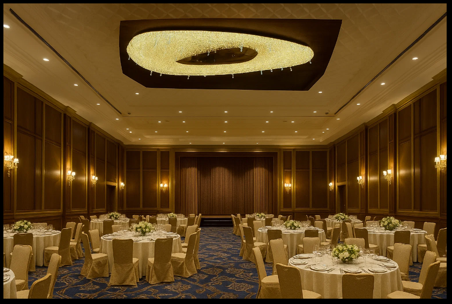 A celestial ring of light. This chandelier’s circular form, adorned with a cascade of shimmering crystals