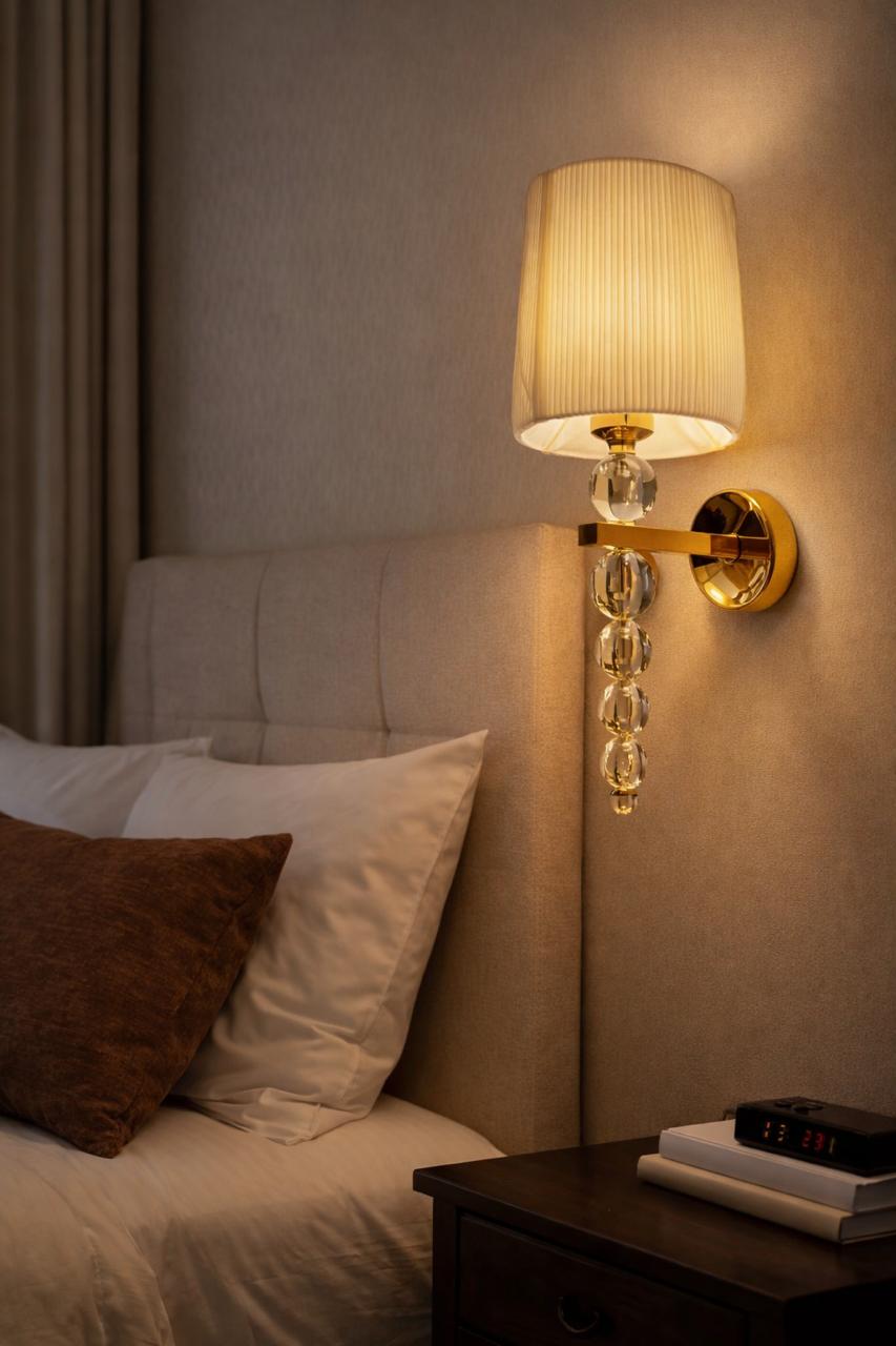 Vertical wall sconce with clear spherical elements and a cream-colored shade, offering a light, refined aesthetic with gentle illumination.