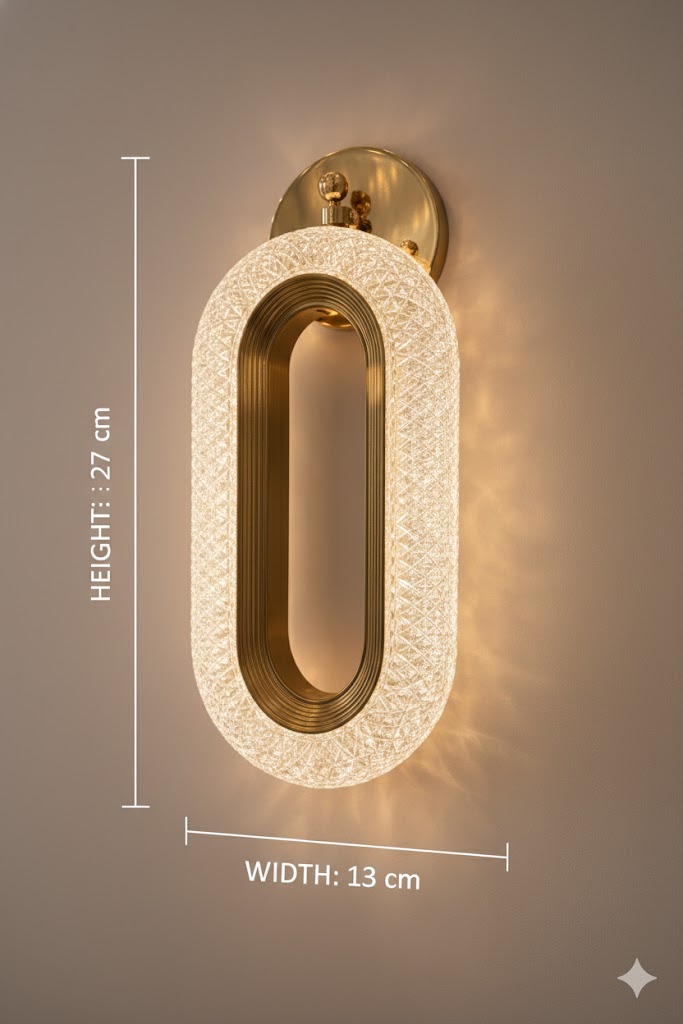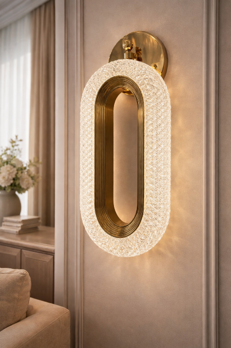 LICHTQUELLE Wall Light is inspired by the quiet emergence of light from natural forms. The elongated oval structure is framed by finely textured glass that captures and refracts light, creating a soft, radiant glow with depth and clarity.