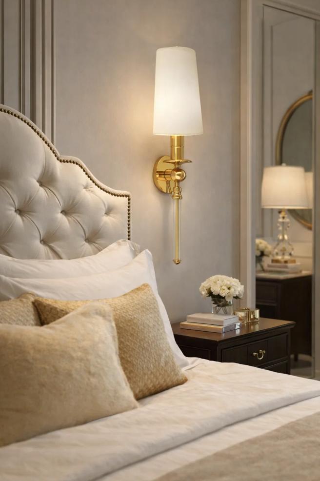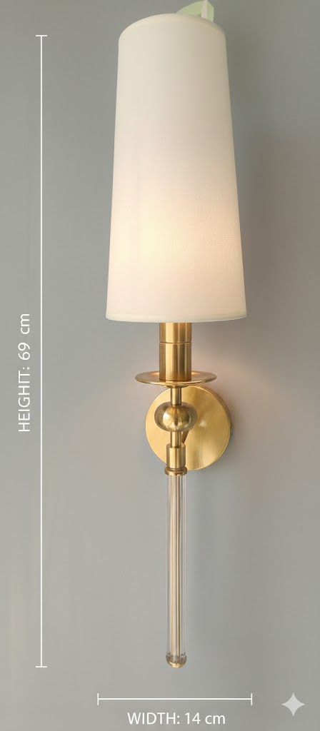 MESSINGRUHE Wall Light is a refined architectural luminaire designed for sophisticated interiors. A tall, carefully tailored fabric shade provides soft, ambient illumination, while the elegantly proportioned solid brass structure adds warmth, stability, and visual depth.